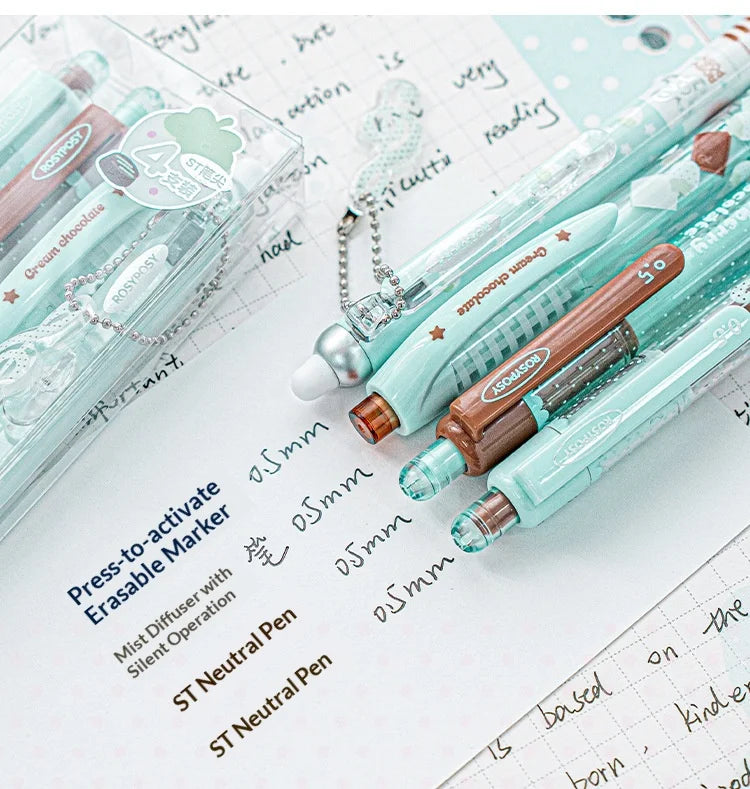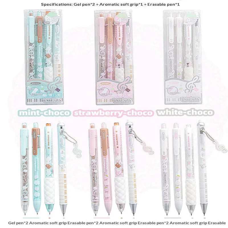 5pcs/Box RosyPosy Chocolate Scented Pen Set – 2x ST 0.5mm Gel Pens + 1x Erasable Pen + 1x Aromatic Soft Grip + 1 Free Pendant (Strawberry/White/Mint Chocolate) No Smudge, Reusable Grip for Long Time Writing