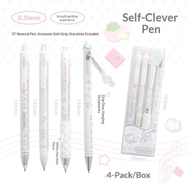 Package Includes: 2 x ST Gel Pens (0.5mm, black), 1 x Aromatic Soft Grip (white chocolate scent, reusable), 1 x Push-type Erasable Pen, 1 x Free Note Pendant (scented)